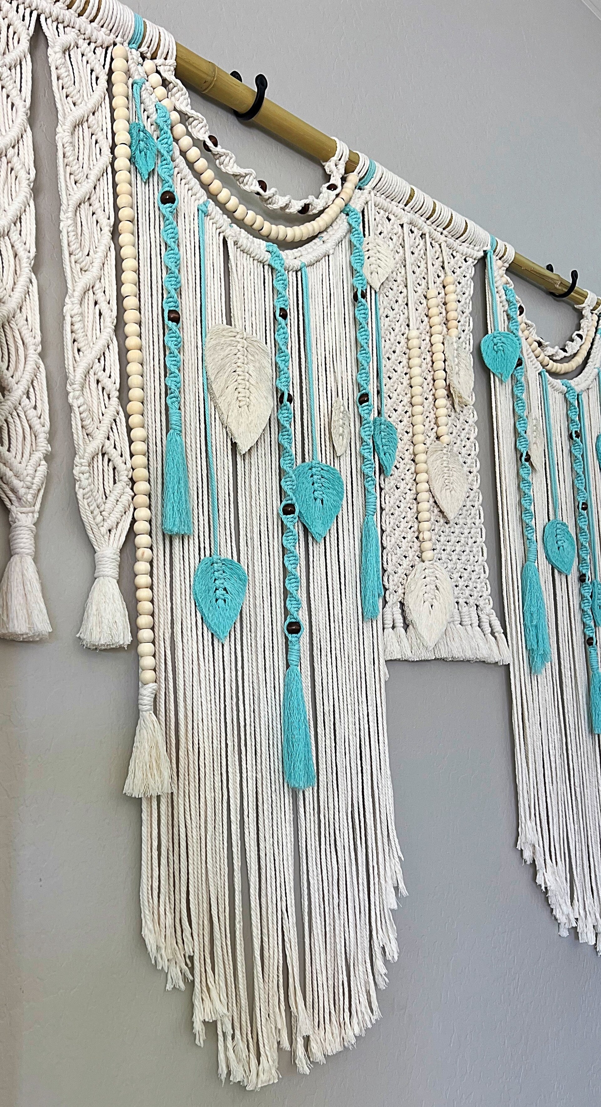 This beautiful wall hanging was created on a 1.5" diameter natural bamboo pole. Measuring 52"L x 72"W